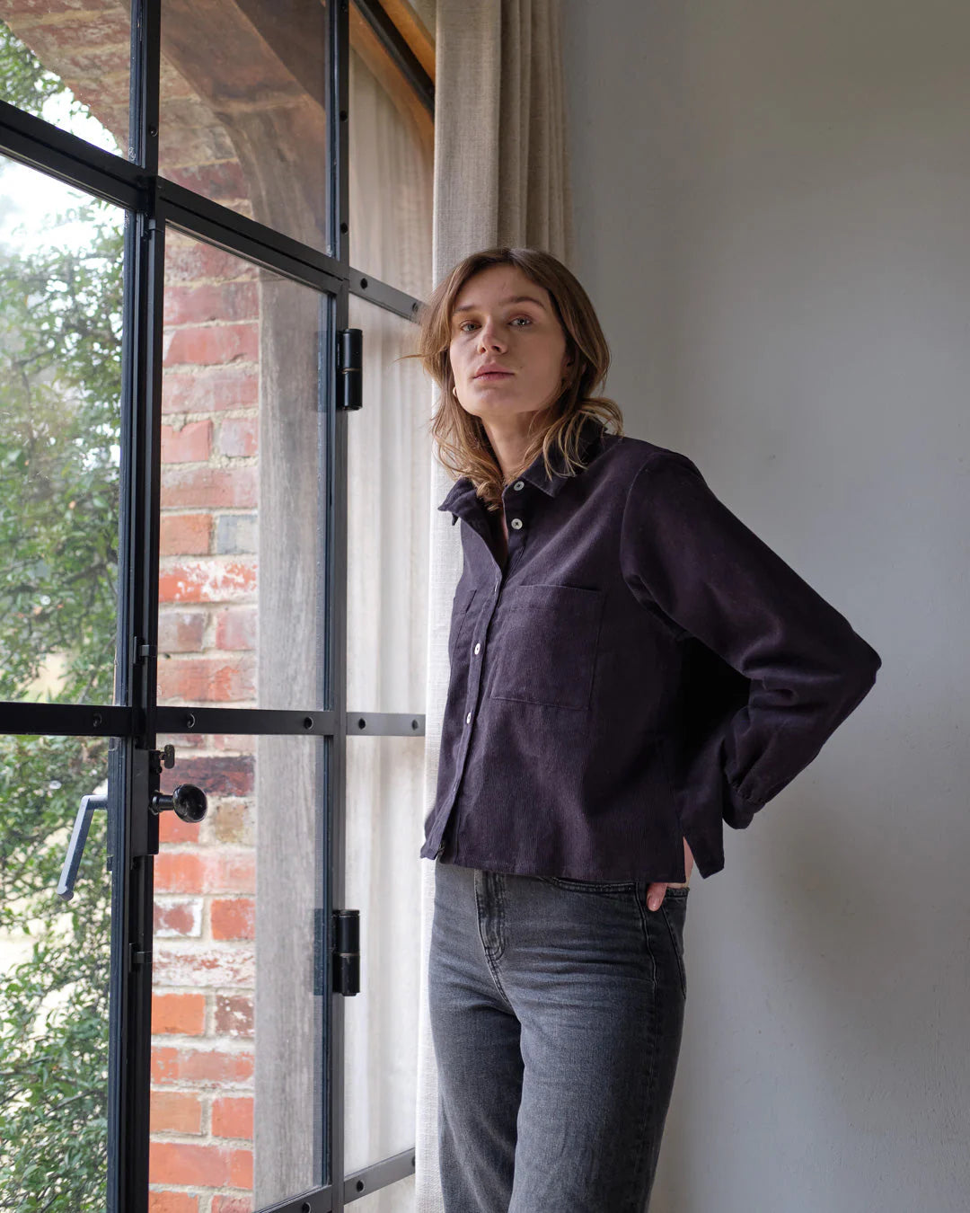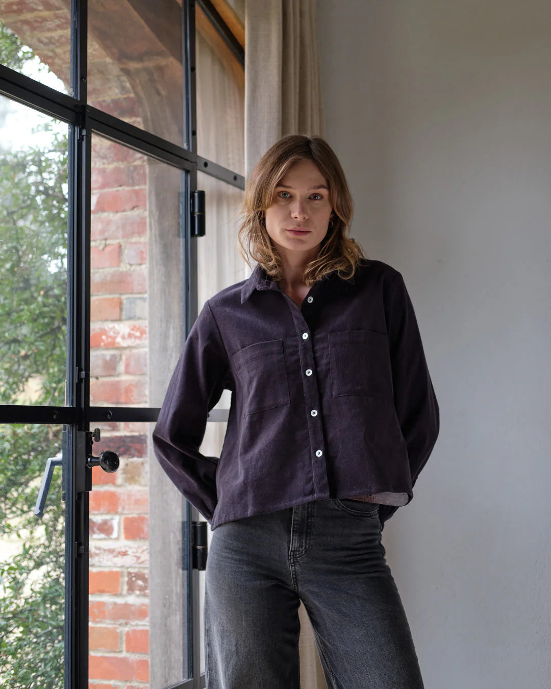 This boxy, cropped shirt is Bibico’s take on a classic collared shirt, reimagined in heavyweight indigo denim for a structured, timeless look. Designed to be worn on its own or layered as an overshirt. In denim, it’s a versatile staple with a workwear feel. It features a gathered back yoke for subtle shape, full sleeves with buttoned cuffs, and two front patch pockets. Finished with imitation shell buttons. Effortless to pair with trousers or a skirt — this is everyday dressing, made better. Made in a selection of fabrics. This one is a wonderful trans-seasonal piece.