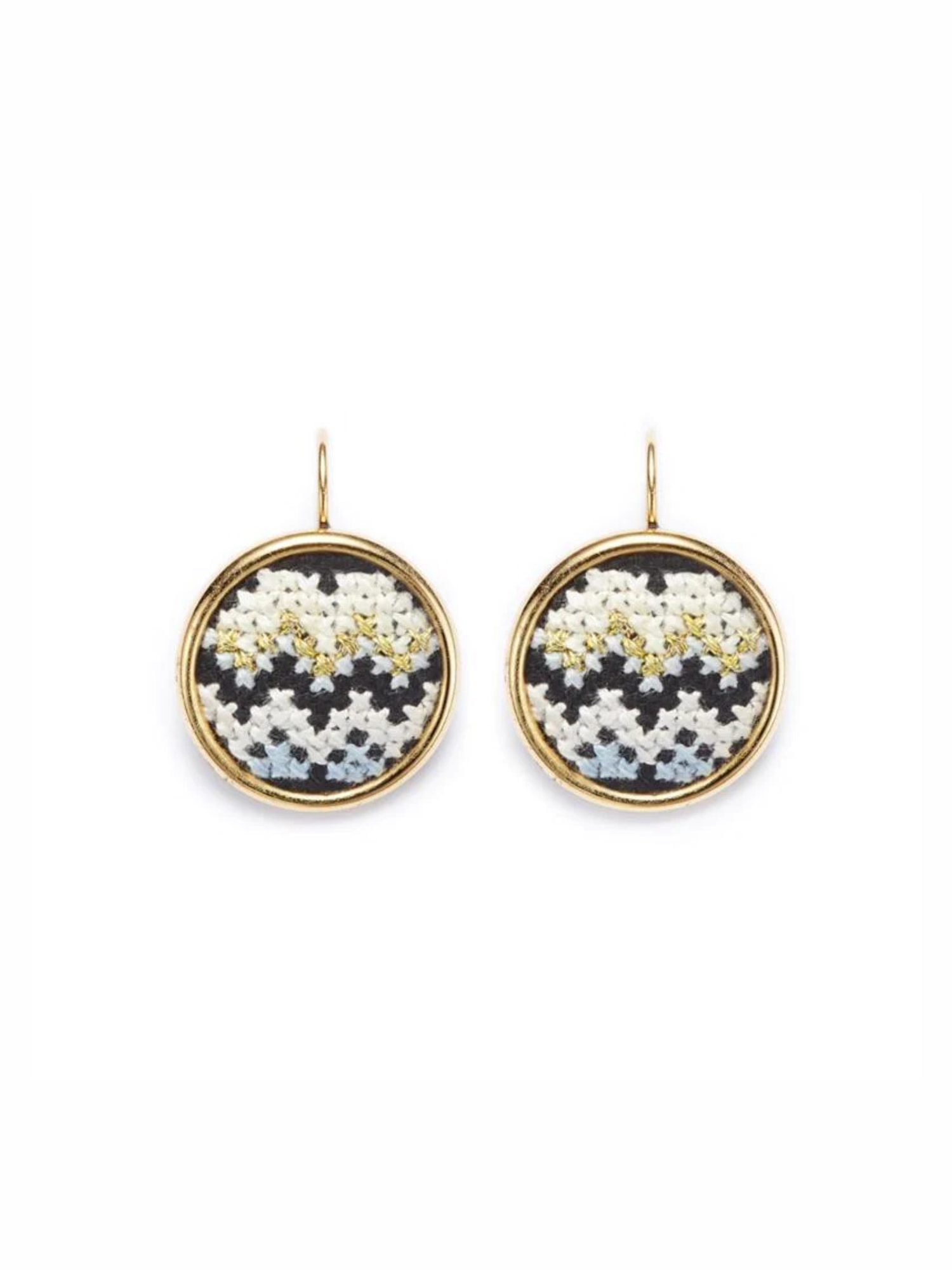 These embroidered earrings highlight the varied heritage and unique cultural narratives of refugee artisans. The patterns are inspired by landscapes of Myanmar and Middle Eastern tile designs.