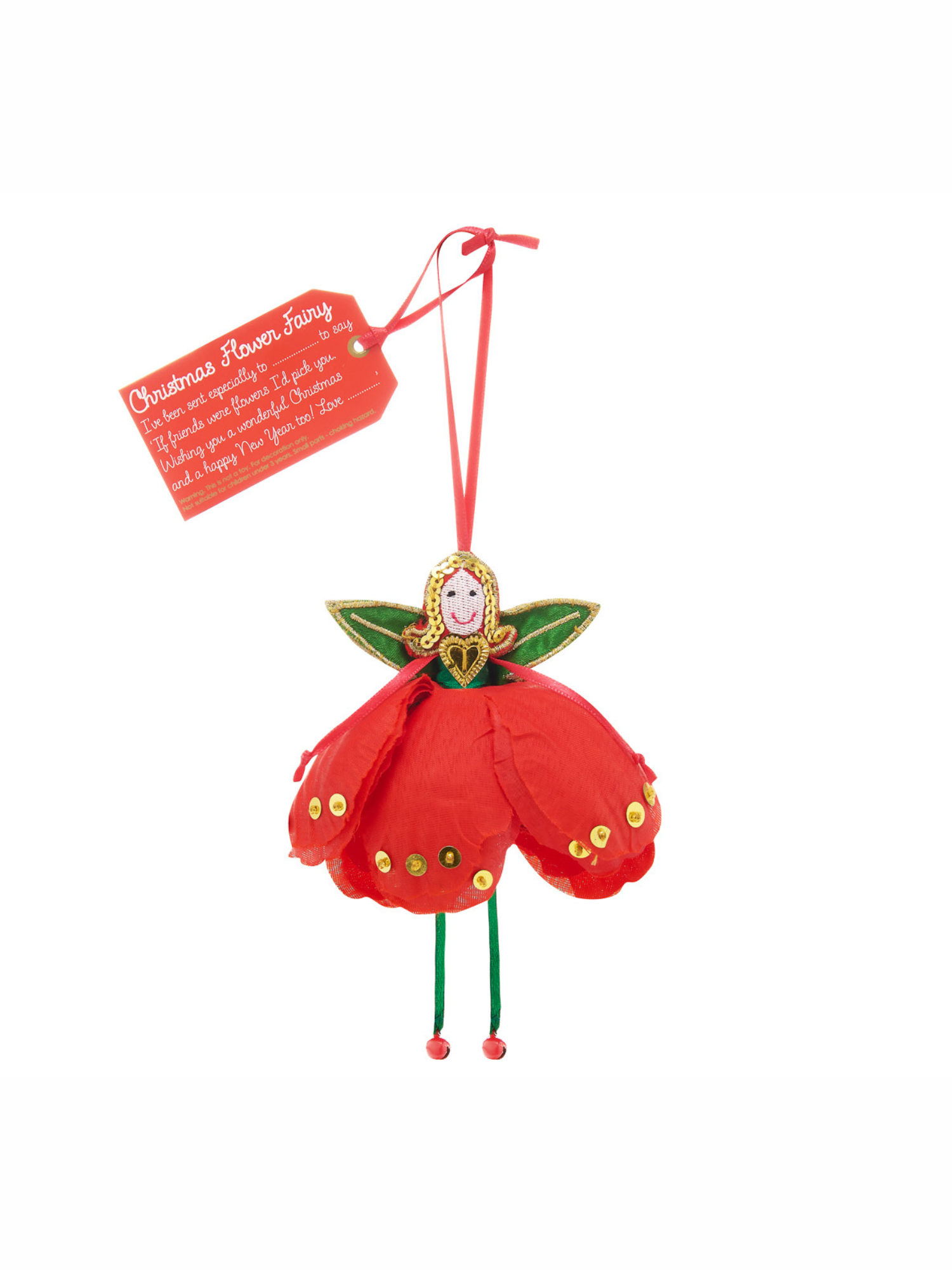 A gorgeous fairy with a layered red petal skirt with gold sequin, a gold heart sequin and gold tinkling bell feet.