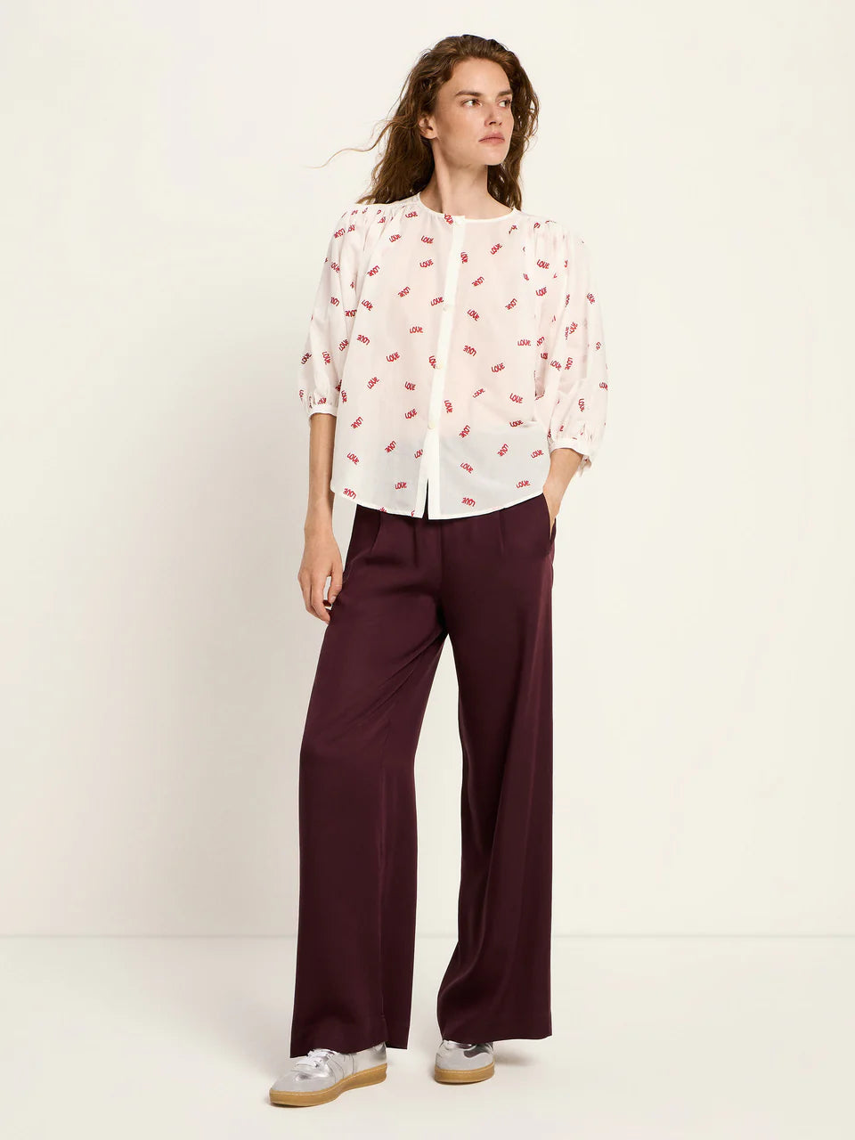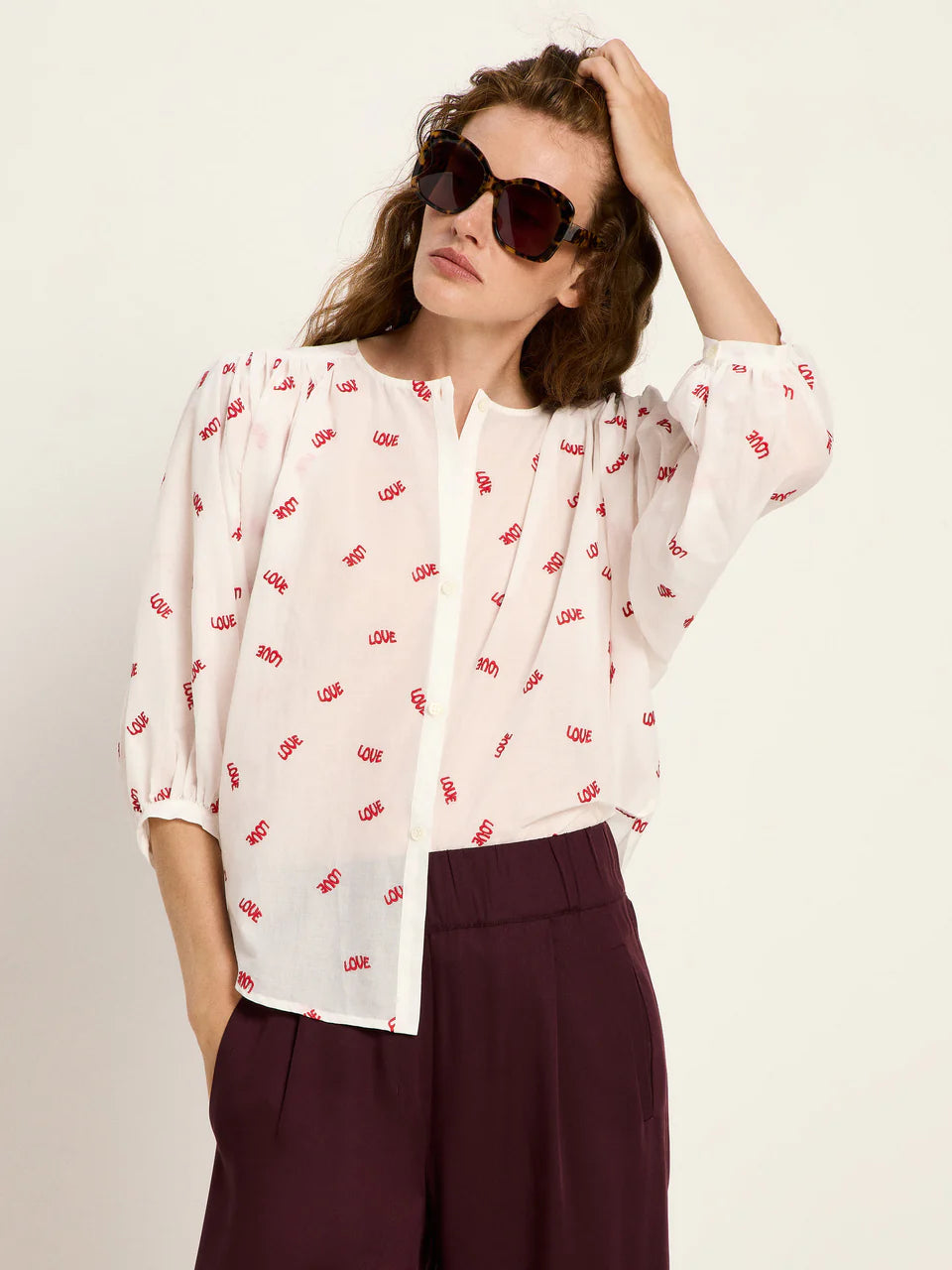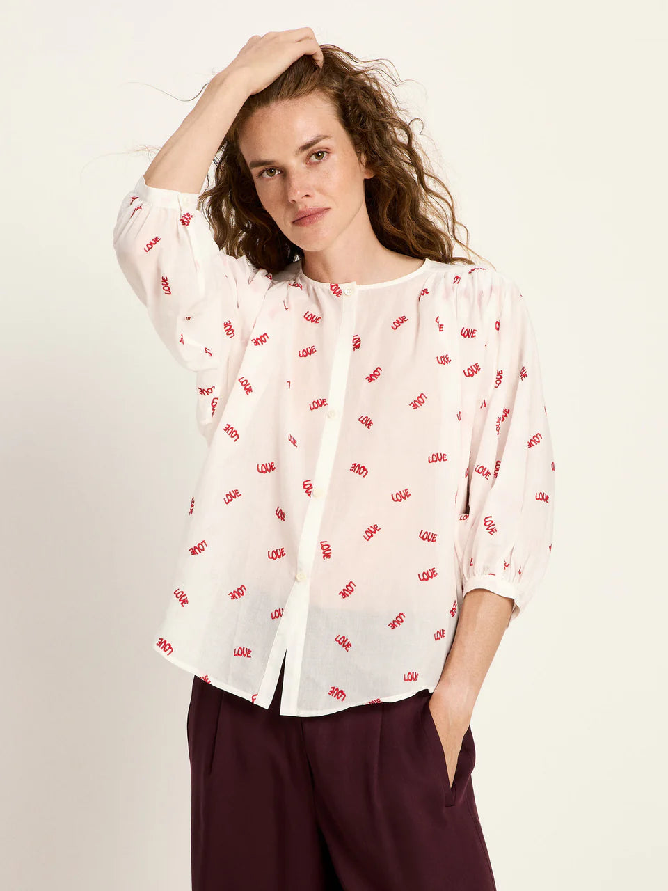 Airy, playful, and made from pure organic cotton: This blouse with ruffle details and an all-over print brings lightness and charm to everyday wear. The delicate fabric feels pleasantly soft against the skin. Fine gathers on the shoulders and back create a feminine silhouette, while the round neckline and shortened sleeves with elastic cuffs create a modern frame – ideal for sophisticated looks with a special accent.