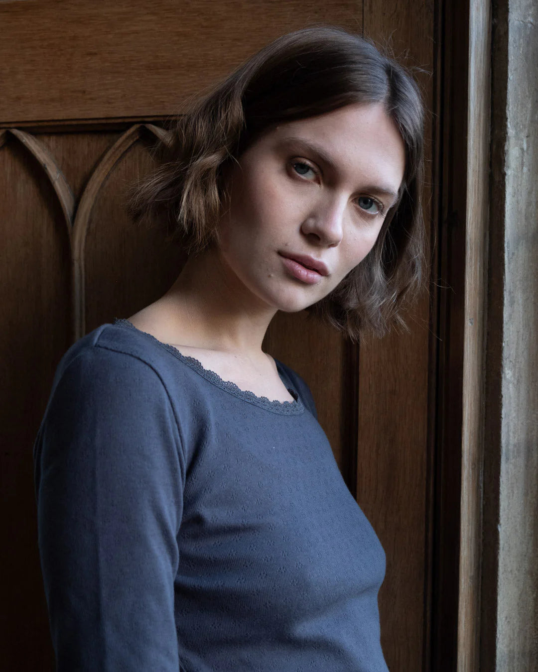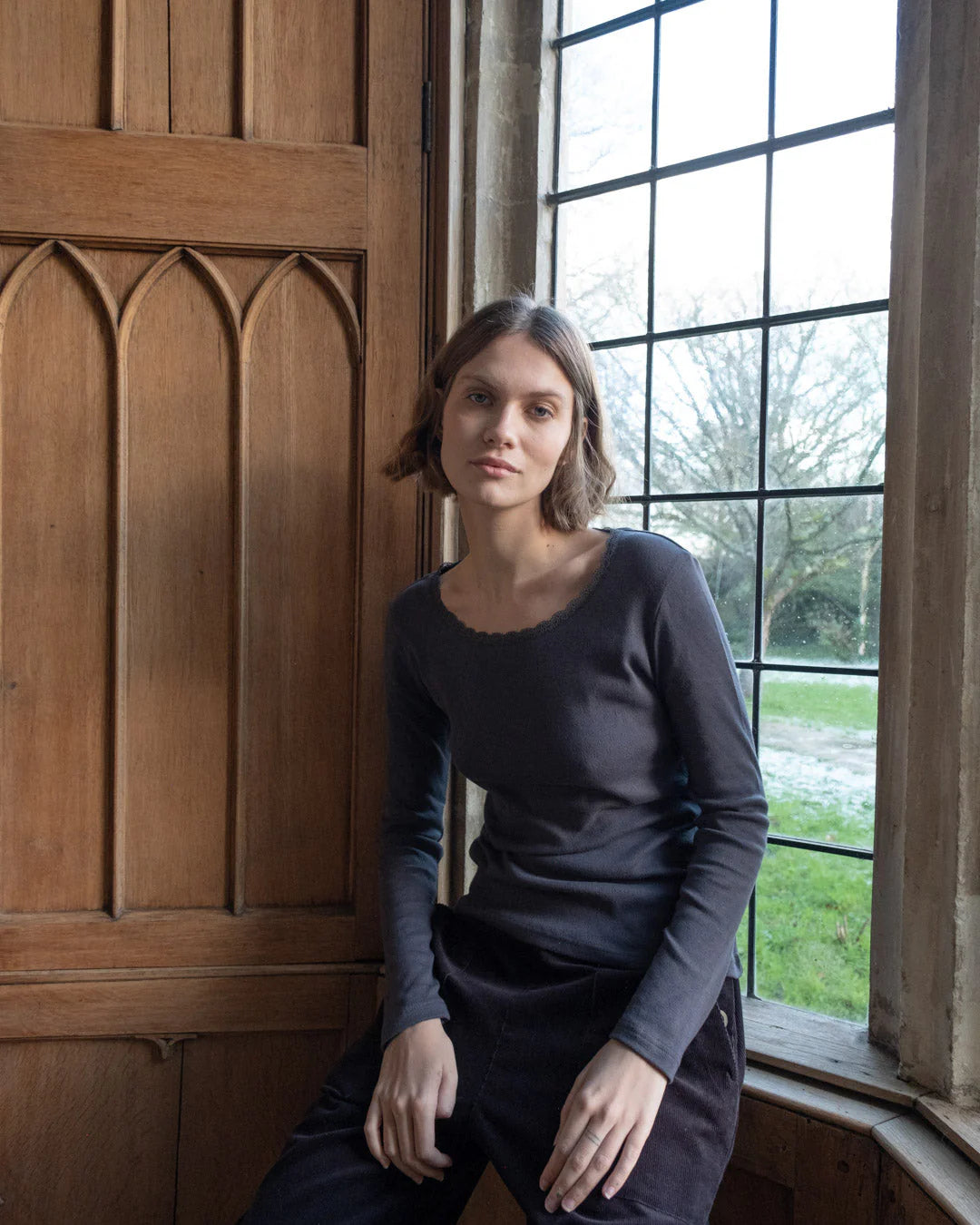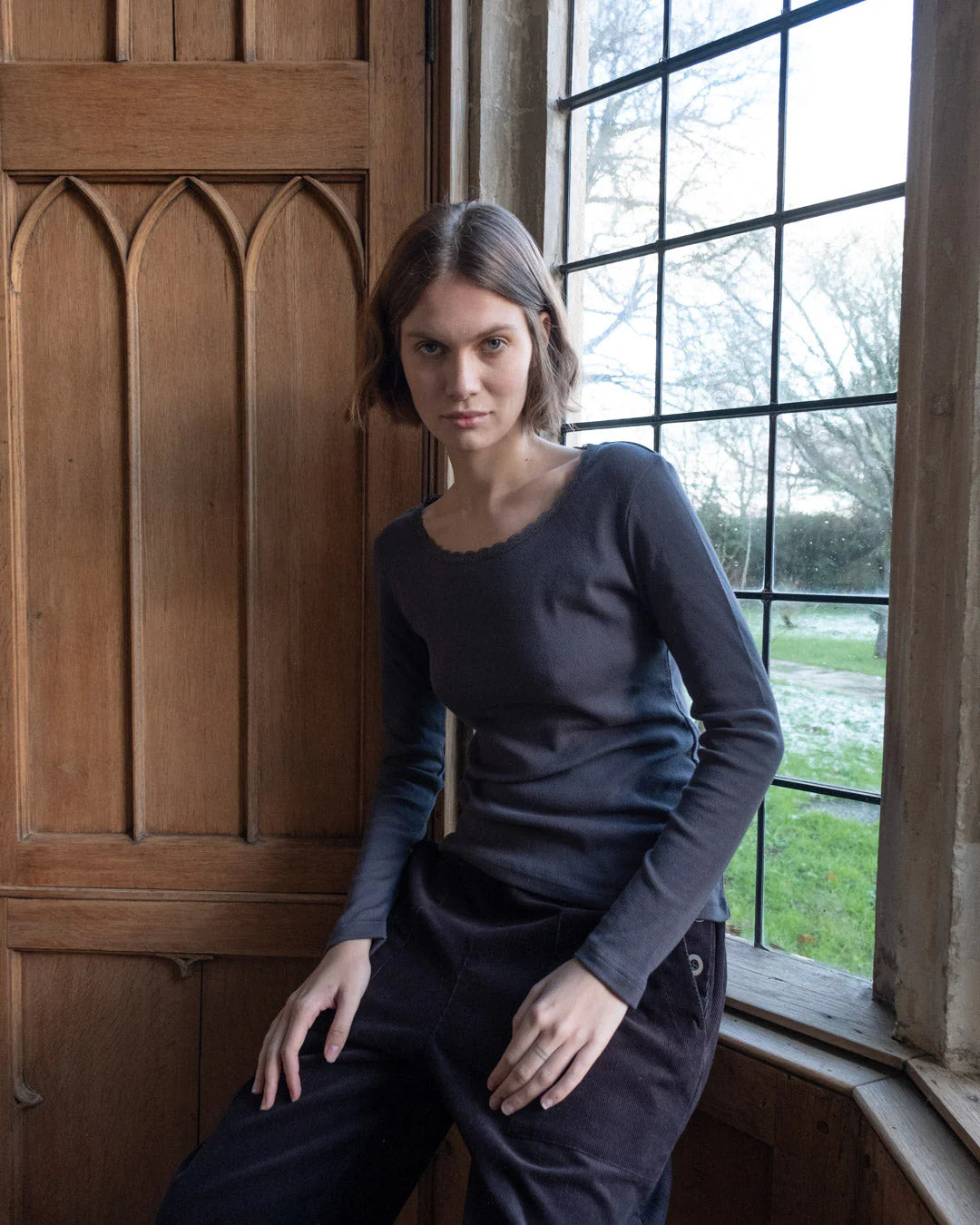 The perfect base layer — soft, simple, and endlessly wearable. Made from pure 100% organic cotton this ribbed top has delicate pointelle detailing and a scooped neckline with scalloped lace trim. The fabric is a rich, super soft jersey cotton. It can be worn as a long-sleeved T or as an extra thermal layer when it is very cold. This season's colours are dove grey and ecru.