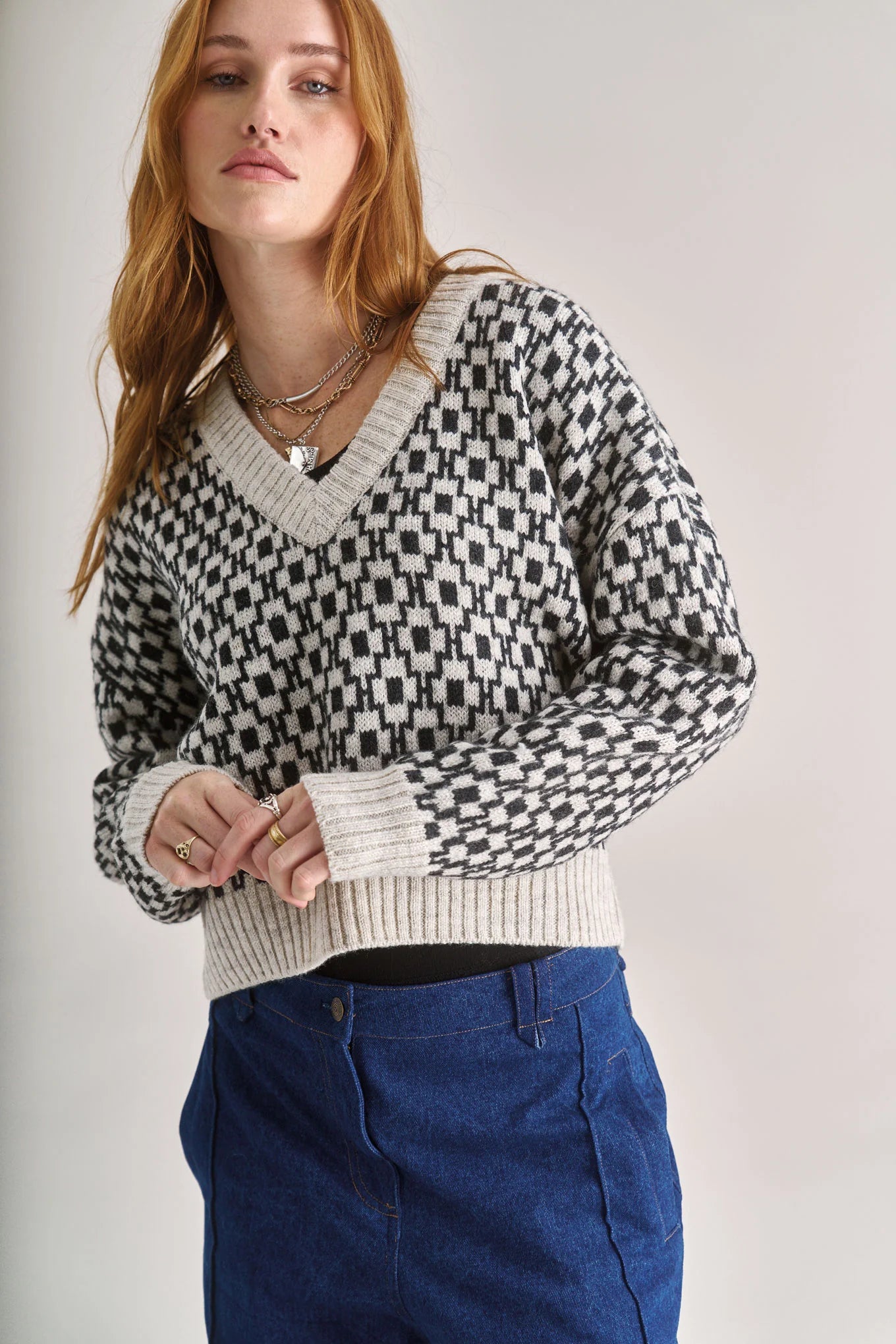 The EFFIE Lambswool Jumper in charcoal offers a cozy, deluxe winter weight crafted from 100% lambswool. Its cropped, boxy shape combined with a textured diamond jacquard pattern adds subtle style to your cold-weather wardrobe, while the natural softness ensures lasting comfort throughout the season. Perfect for layering or wearing on its own, this jumper balances warmth and breathability effortlessly.