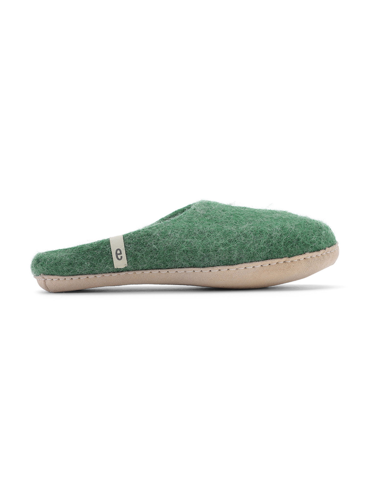 Unisex, Sustainable wool slippers in Green. Egos shoes are handcrafted from pure new wool using eco-friendly dyes to create fun colours. The slipper has a double insole made from natural felt for extra comfort and support, as well as a suede outer sole for durability, grip and structure.