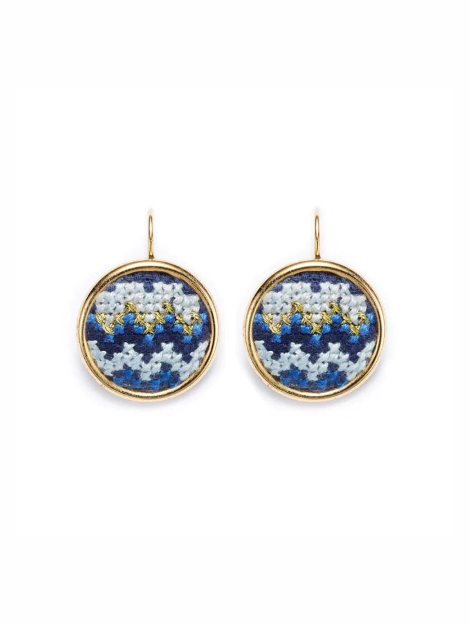 These embroidered earrings highlight the varied heritage and unique cultural narratives of refugee artisans. The patterns are inspired by landscapes of Myanmar and Middle Eastern tile designs.