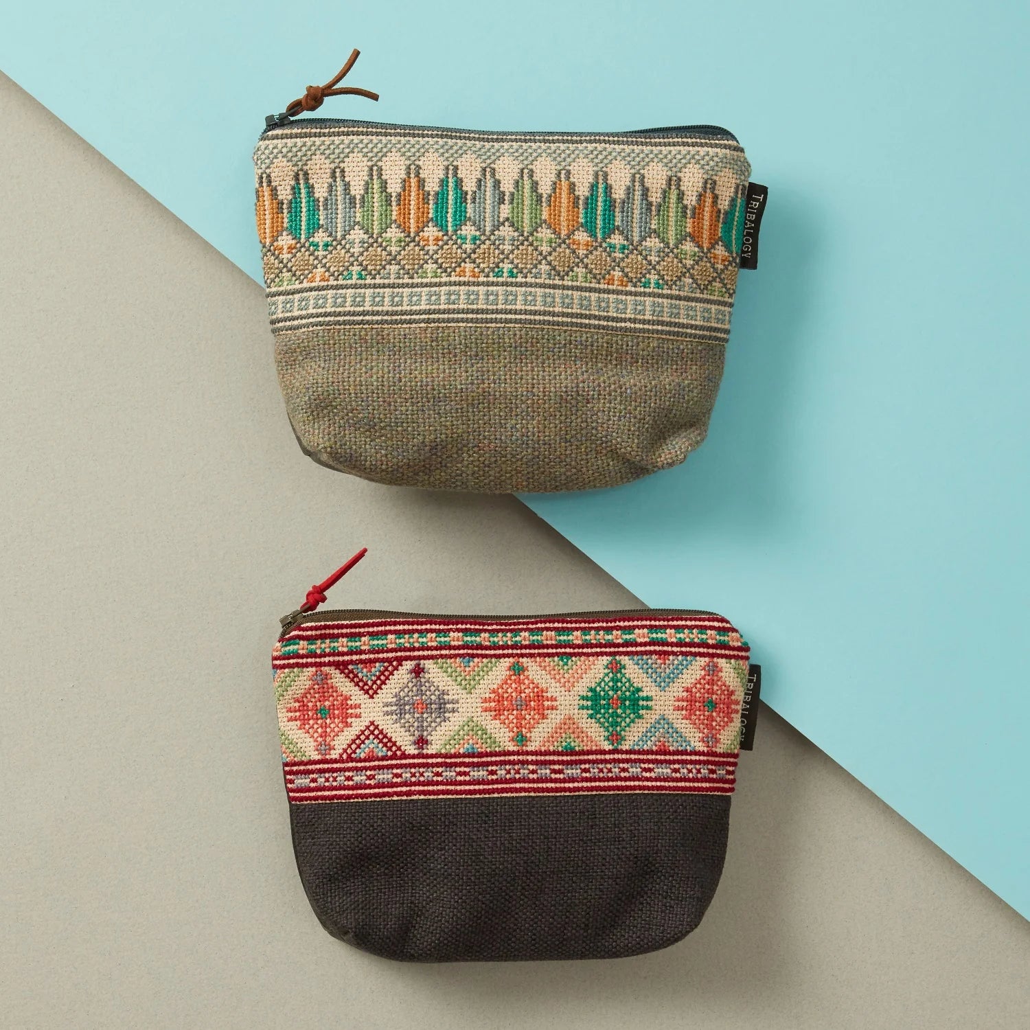 Intricate cross-stitch embroidery techniques shine through in this unique pouch that brings together Middle Eastern design and Japanese-inspired aesthetics.