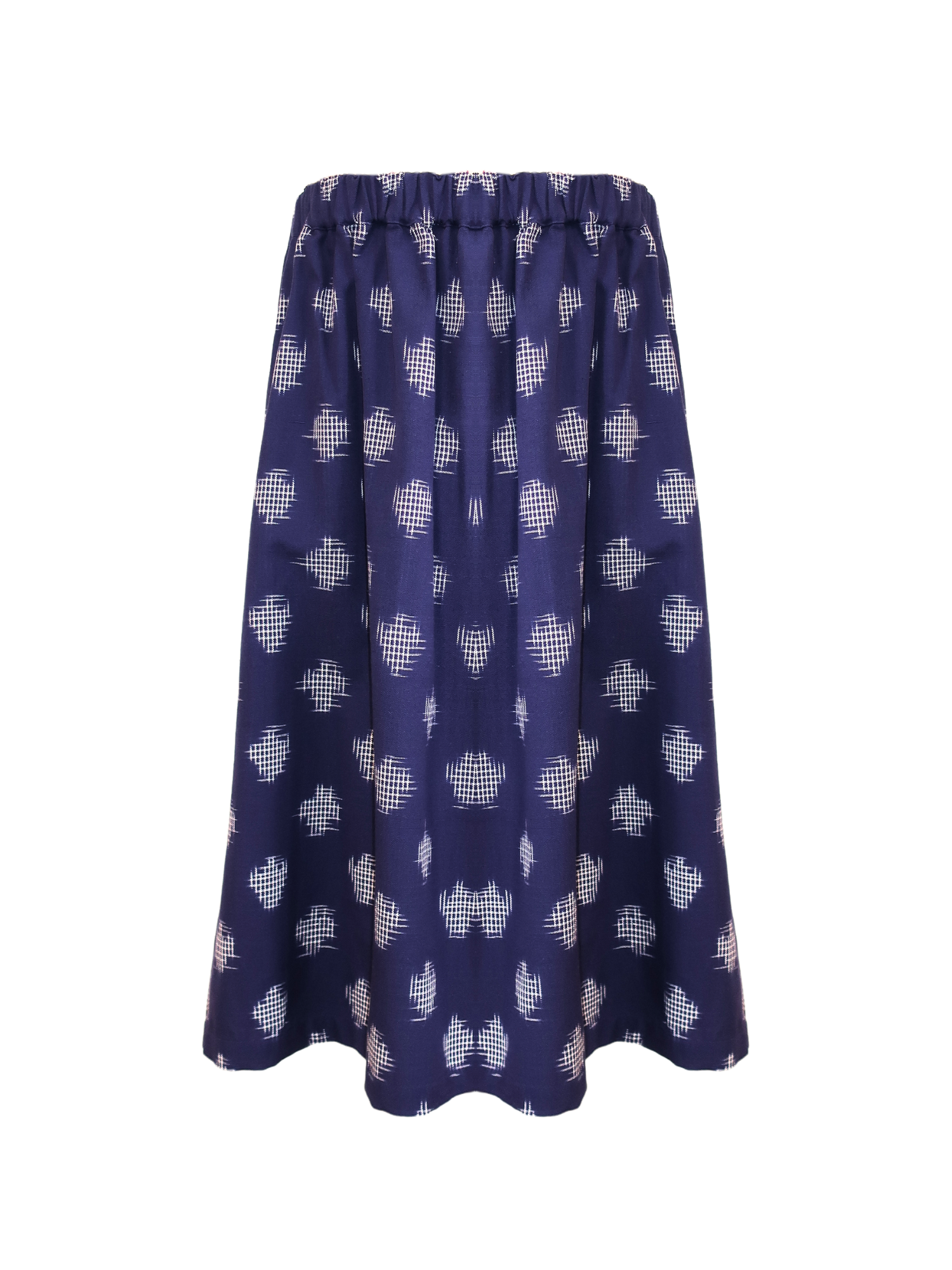 This skirt is made from a very special ikat fabric. Ikat is a traditional Indian fabric requiring great skill and years of experience to weave. We love the simplicity and the history that lies behind every dot. It’s made in high-quality, midweight cotton in a rich indigo hue.