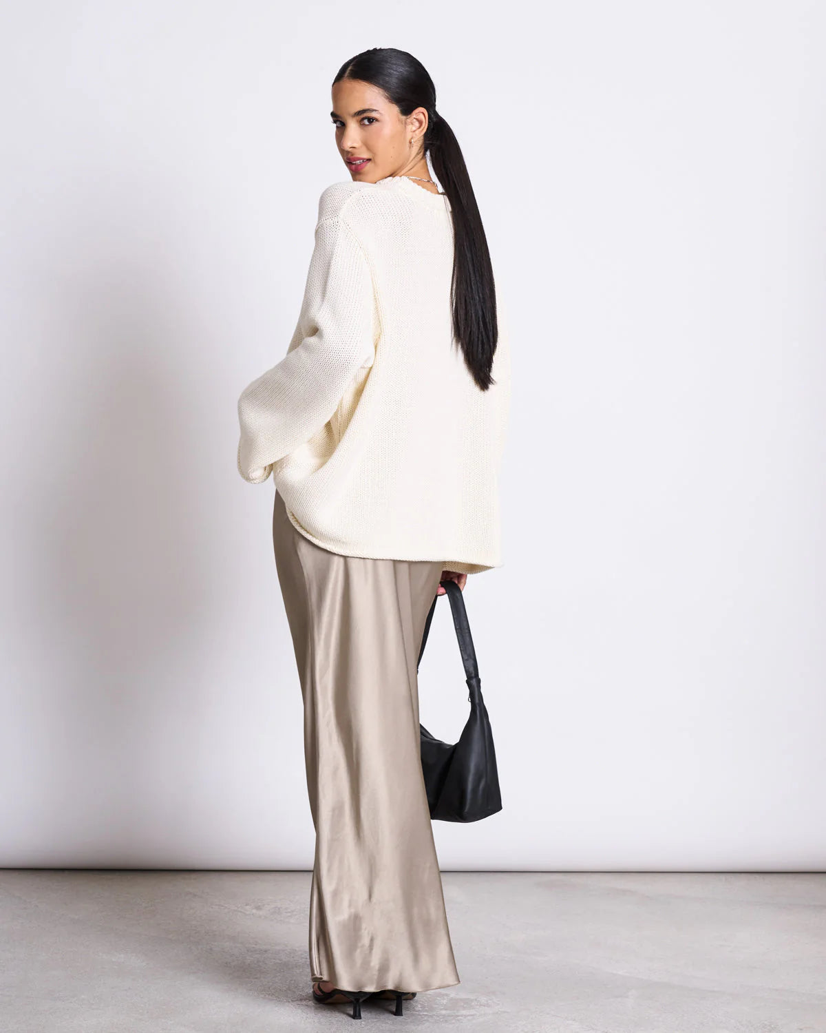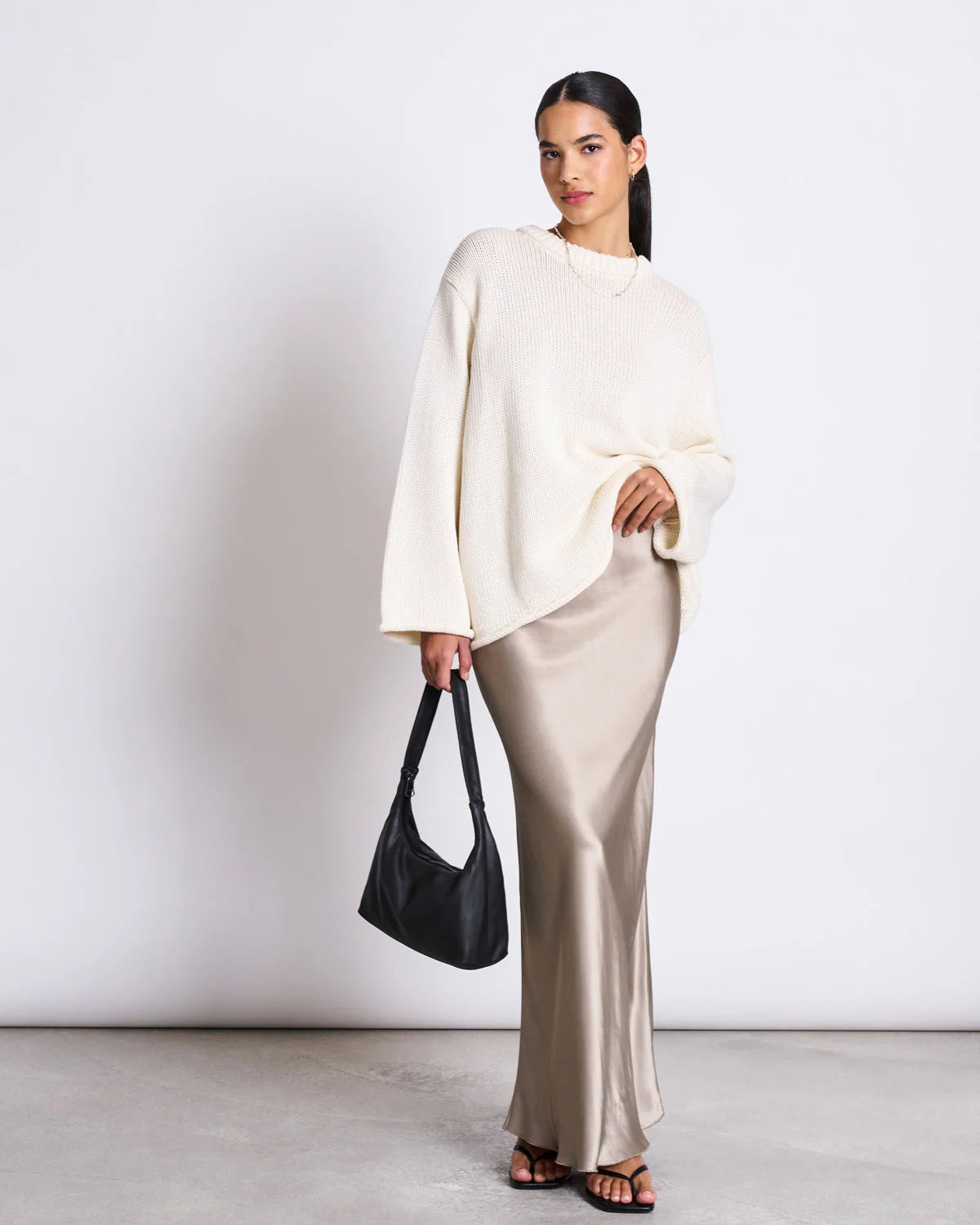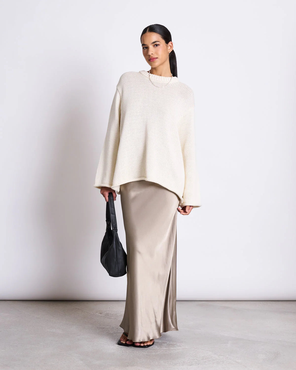 This is SONA, giving us oversized and coziness vibes. It has a tighter, thick neckline and rolled hems. The cut is rather longer and wide and will keep you in comfort whenever needed. The sleeves are also quite wide for an extra cool look.