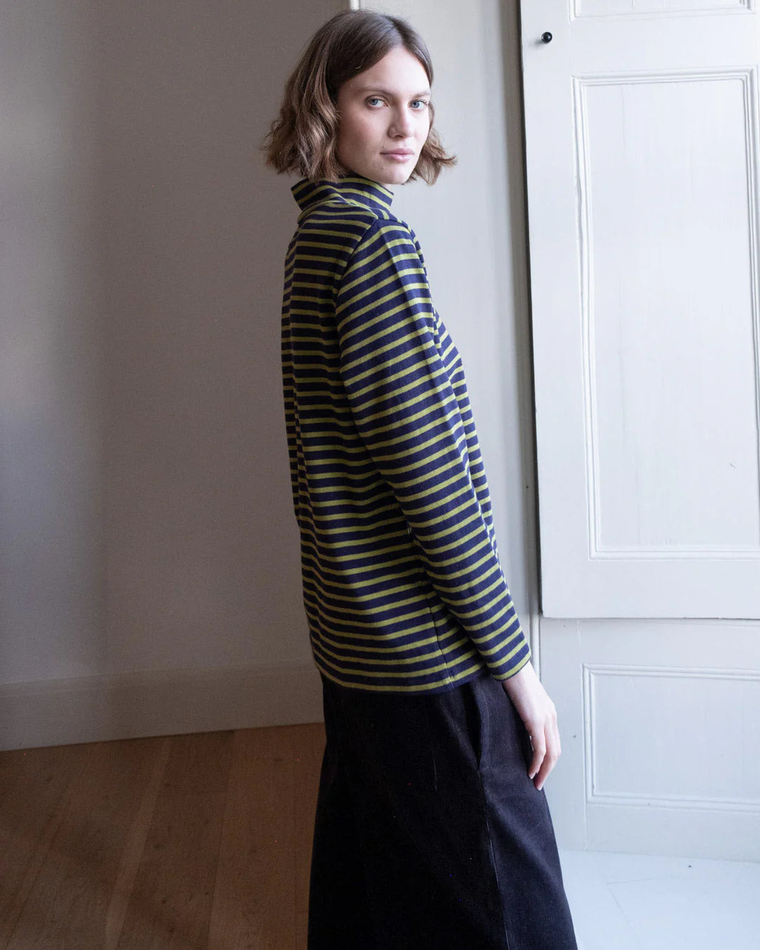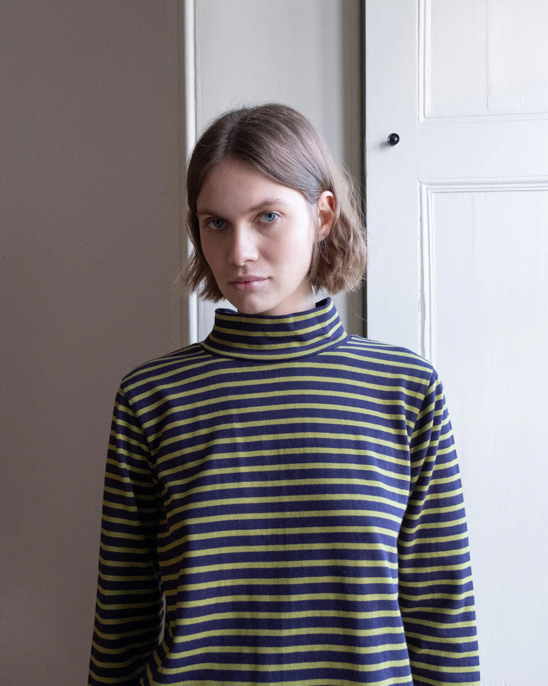 A classic cut T with a high neck. Made in Bibico's signature mid-weight, rich, soft, organic cotton jersey, this is a beautiful layering piece for the cooler months. It can also work as a lightweight jumper in the summer. It sits neatly on the shoulder, has full-length sleeves and falls at the top of the hip. This season’s palette features two unique stripe combos: navy with retro blue, and navy with chartreuse — all custom-dyed and woven exclusively for us. The organic jersey cotton is of a superior quality (our customers often comment on it), making this a go-to layer with year-round appeal.
