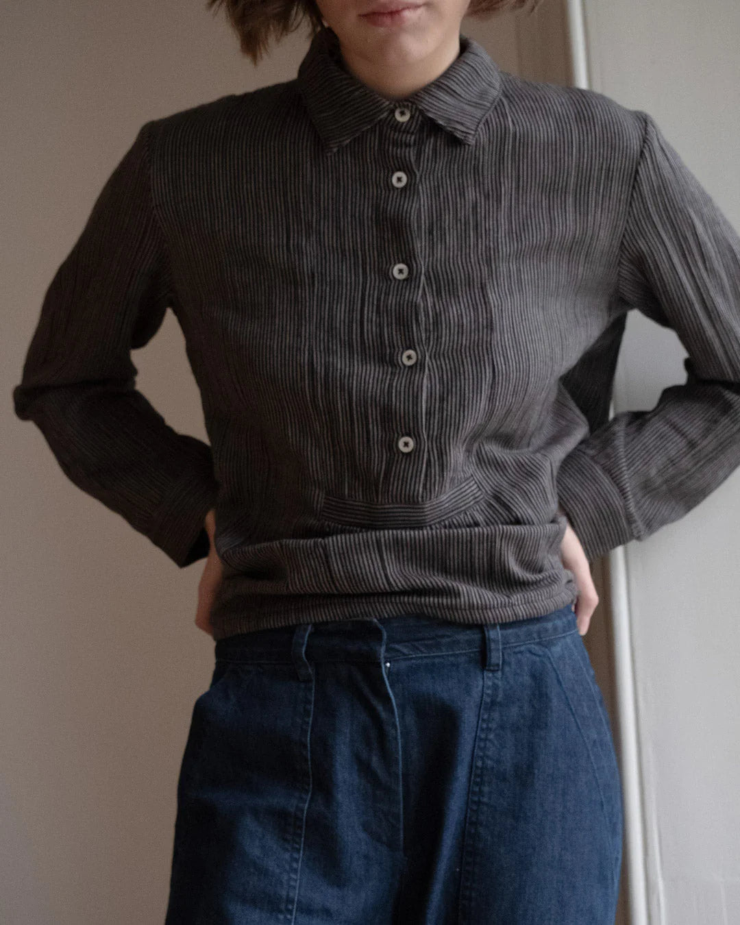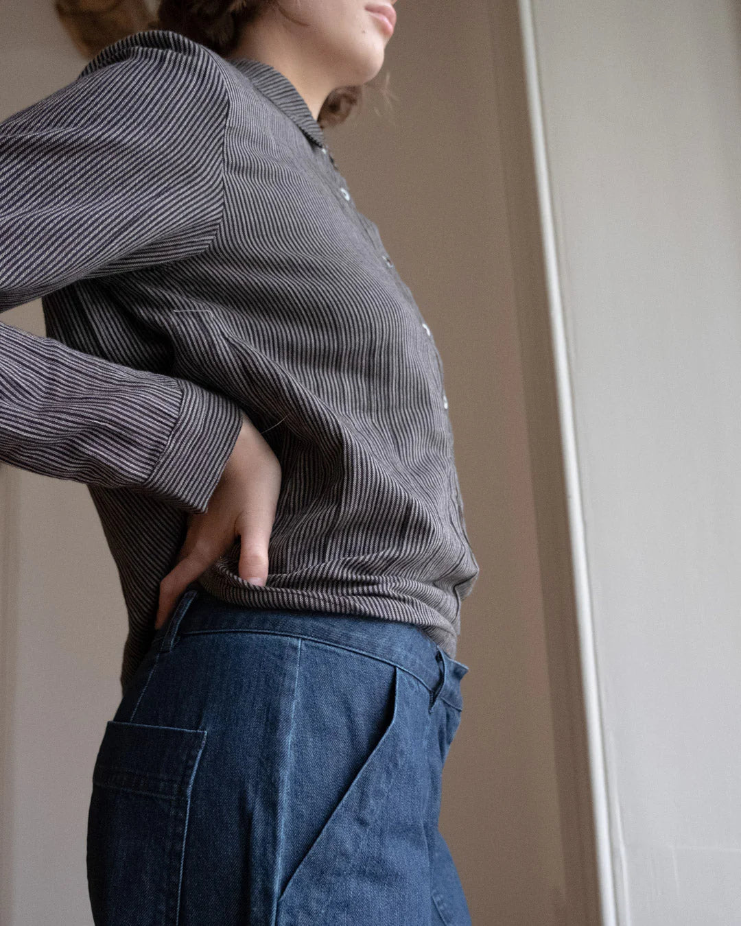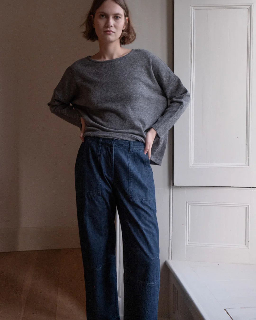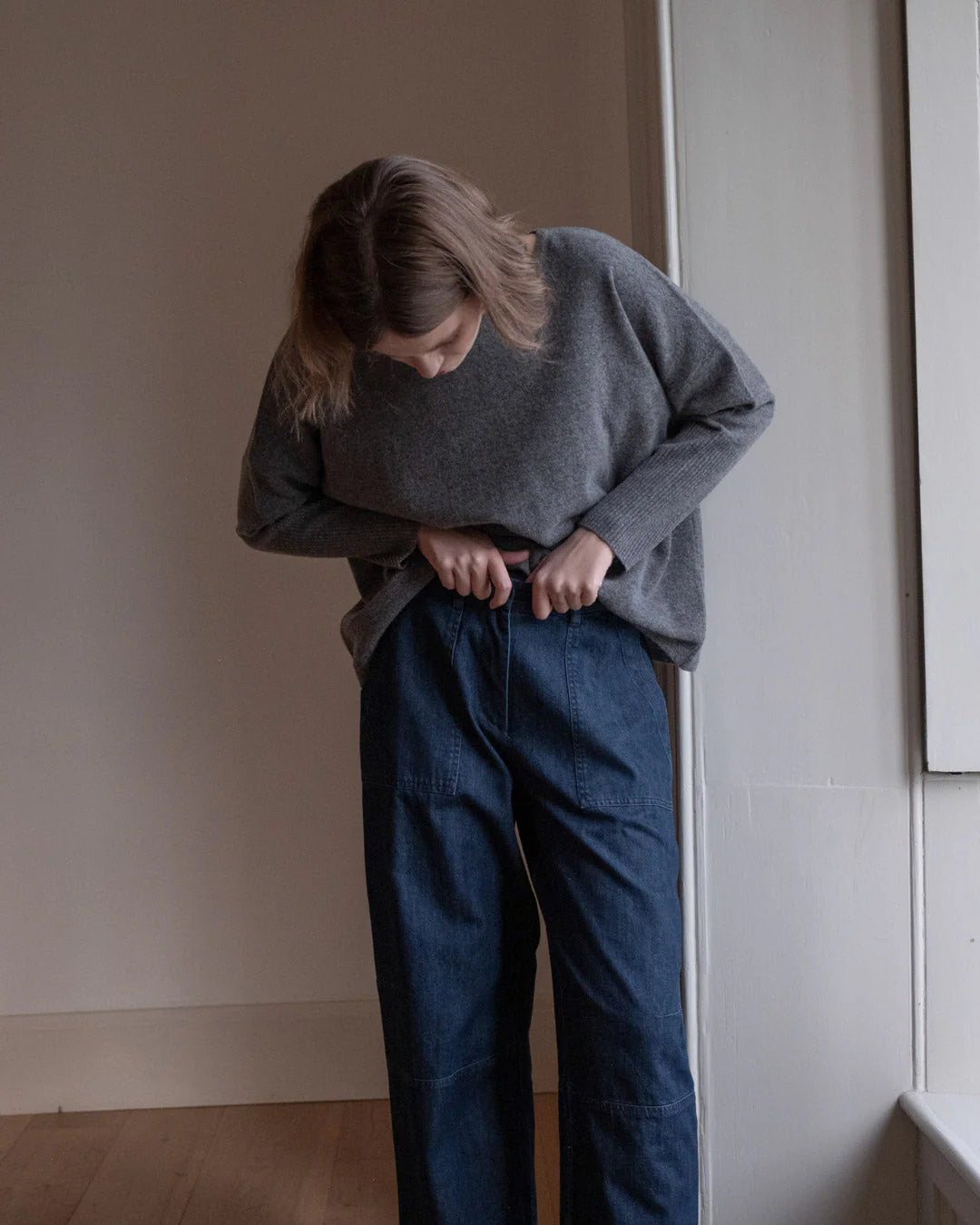 Our most tailored trousers, made from mid-weight blue denim with a clean, structured finish. Designed with a flat front, mid-rise waist, and full-length, gently tapered legs. Twin-needle stitching adds subtle detail, while the hook-and-bar fastening and zip fly keep the look neat. Finished with two deep side pockets and belt loops for styling versatility. A smart yet easy-to-wear piece that works across the seasons. For a more relaxed fit, we recommend checking the size guide and sizing up. A hardworking wardrobe staple you'll reach for again and again.