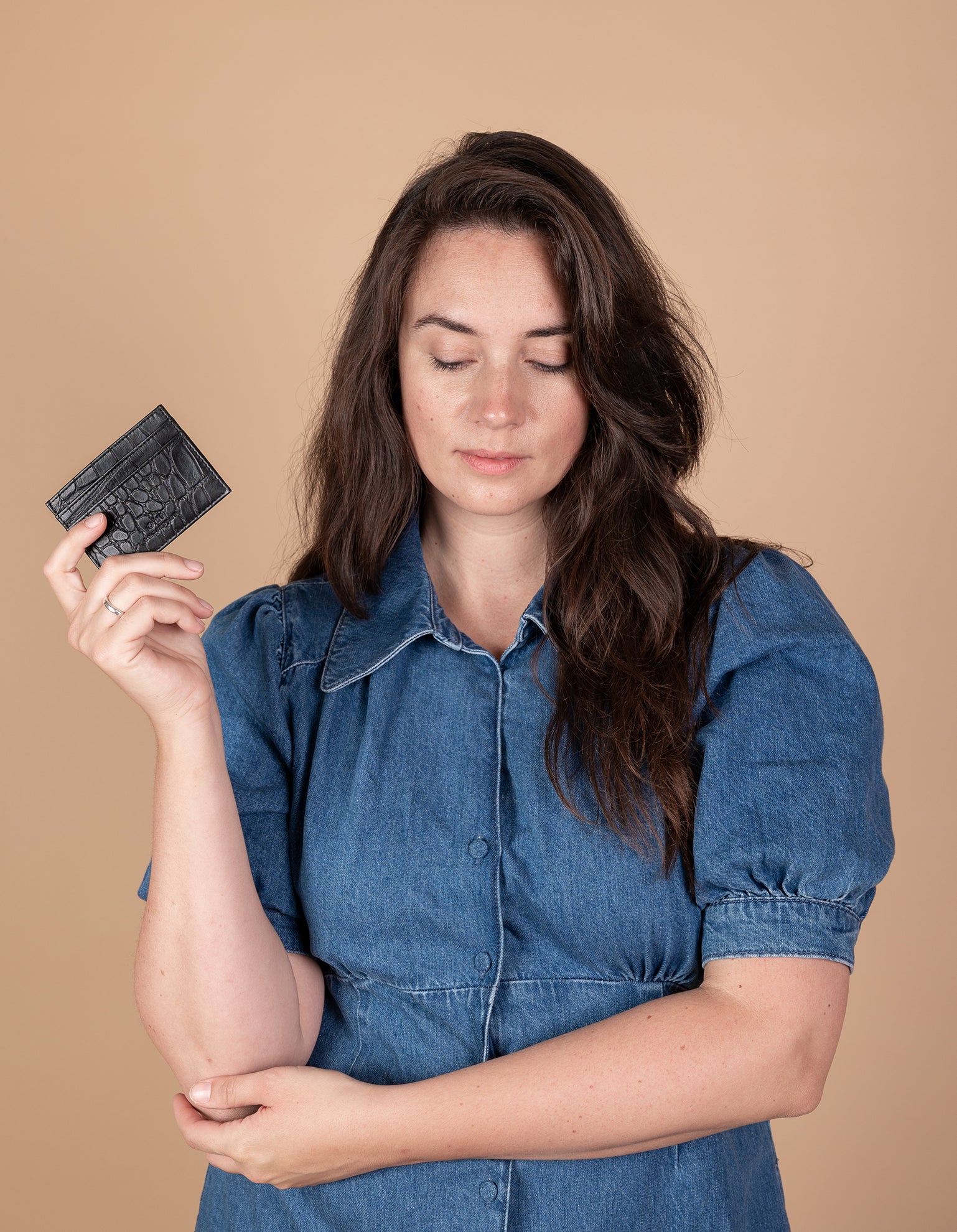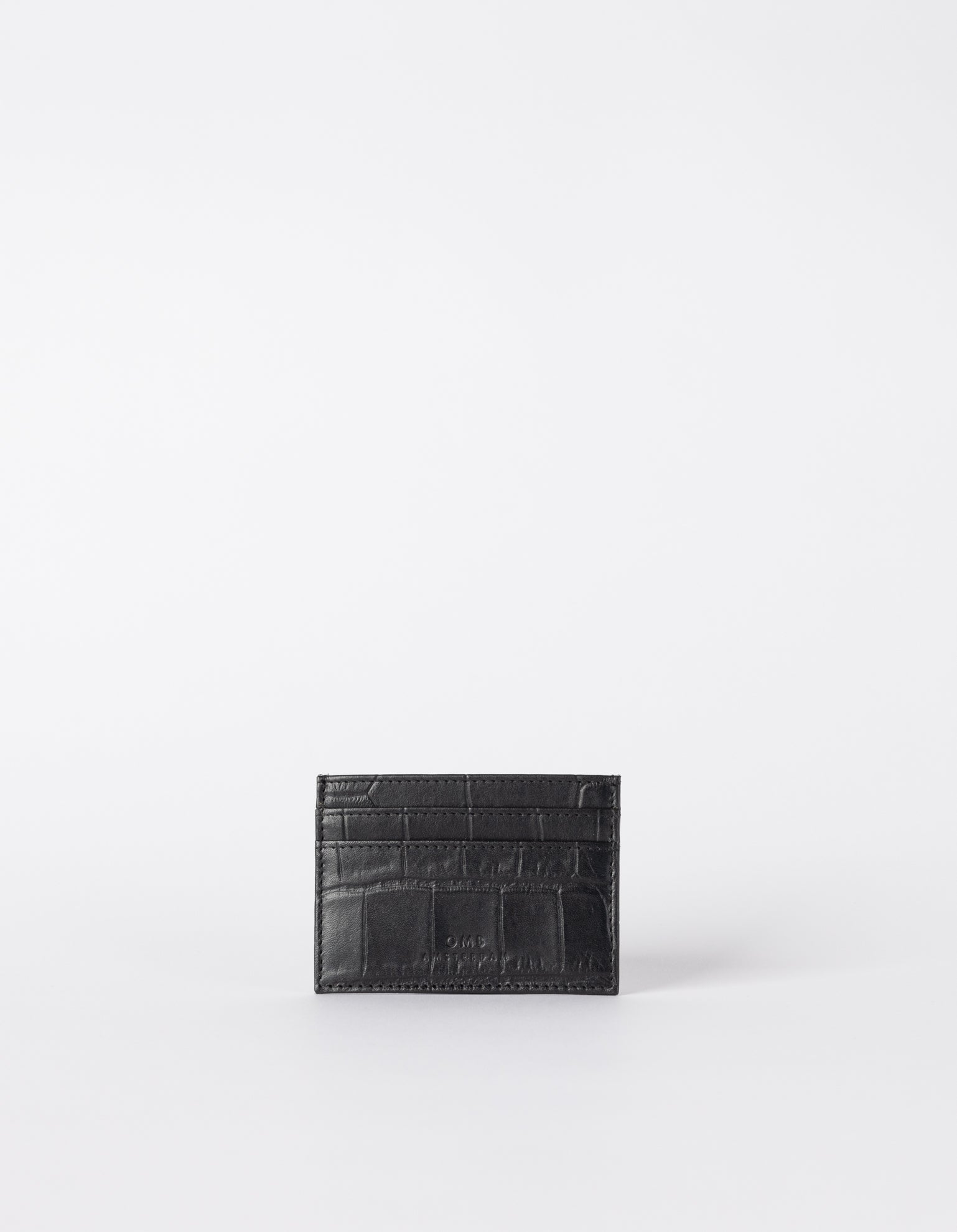 The Mark's Cardcase from O My Bag in black croco is a minimal card holder made from eco-friendly leather. The Croco print is heat pressed into the leather, creating a pattern that is unique to each individual bag, adding even more unique details.