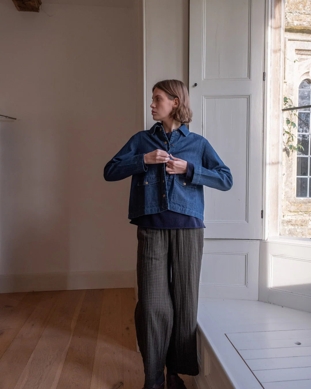 Crafted from 11oz indigo denim, this jacket is made using deadstock fabric from a previous season — part of Bibico's ongoing effort to reduce waste. Washed for softness and to bring out the detailing, it has lived-in ease from day one. Tailored to sit neatly on the shoulders with a clean, structured shape. Fastened with classic brass tack buttons for a workwear feel and finished with two deep patch pockets and full-length sleeves. A timeless layer with purpose — built to last, made with intention.