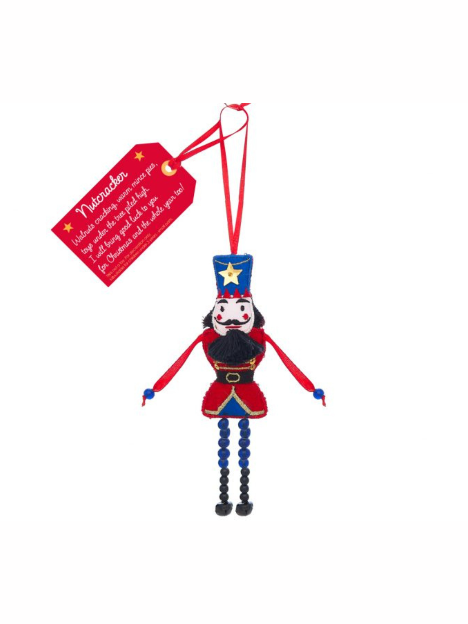 A fabulous Nutcracker with a red velvet cotton coat, bushy beard, gold sequin detail, beaded legs and bell feet.
