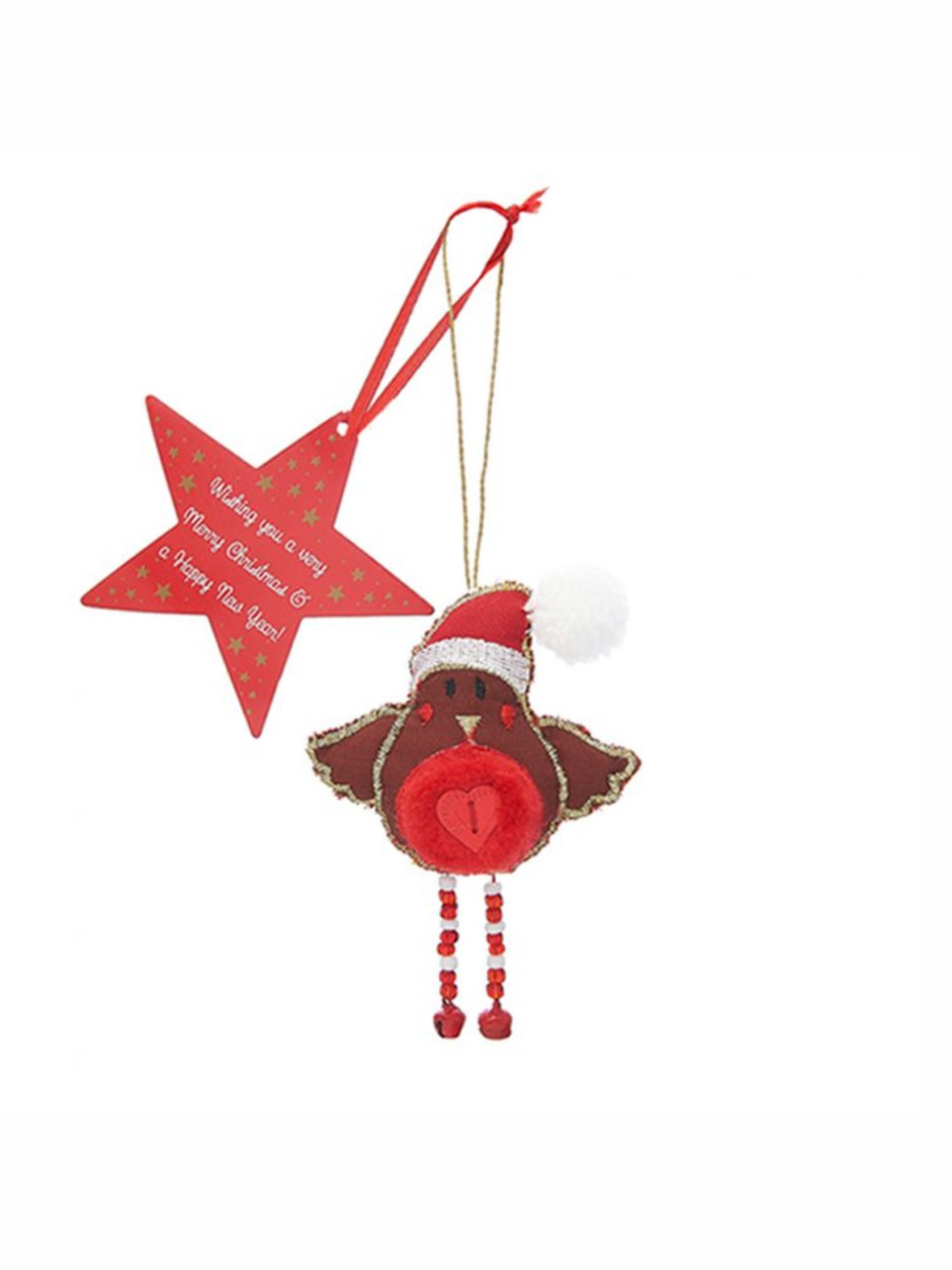 A cute robin with red and white beaded legs, tinkling bell feet, a red fur tummy, pom pom hat and sequin detail.