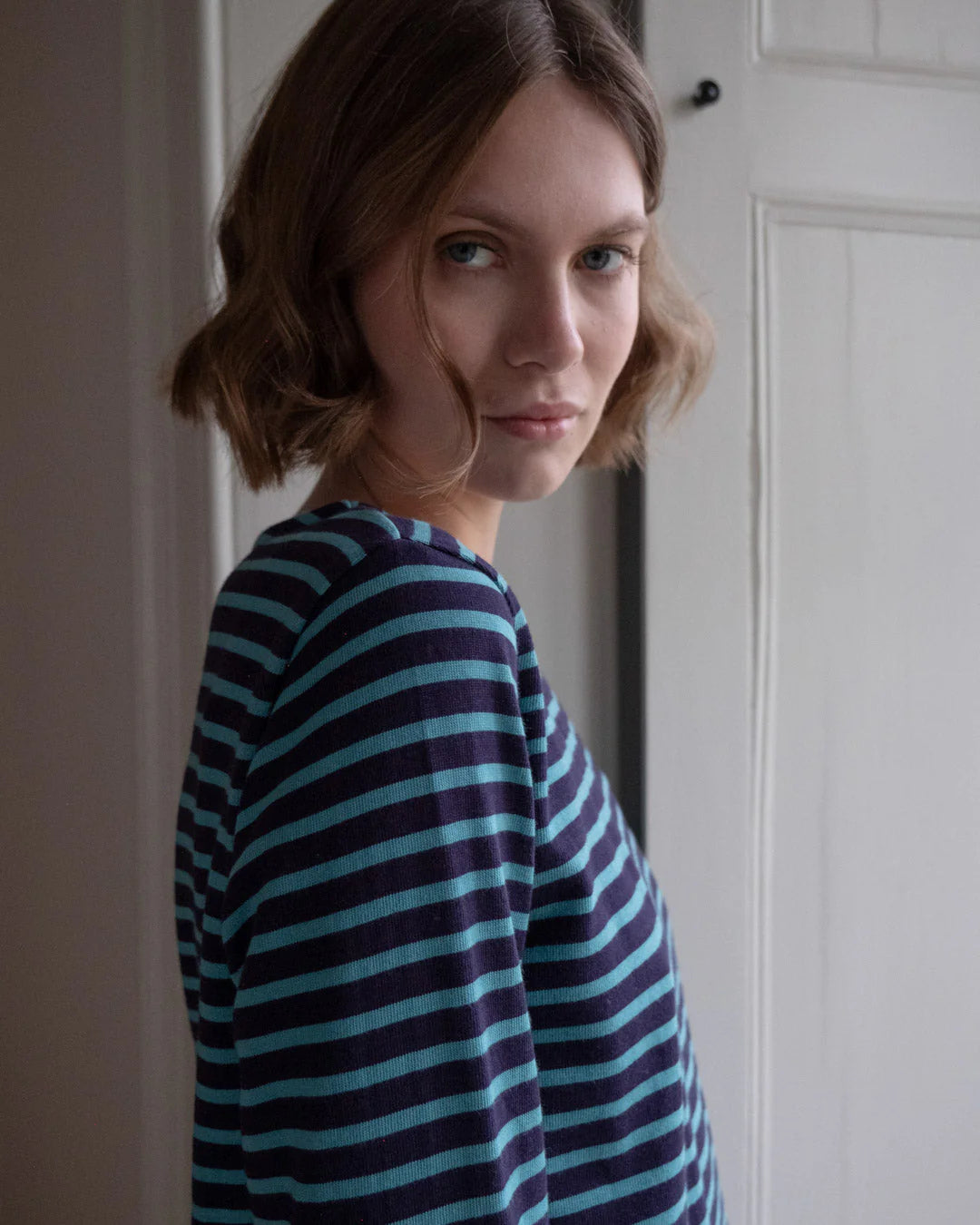 Our classic sailor T returns for Winter. Cut from rich, soft, organic cotton jersey, this timeless striped top is a true BIBICO staple. Designed with a boat neckline, twin-needle stitching, wrist-grazing sleeves and finished with two patch pockets. This season’s palette features two unique stripe combos: navy with retro blue, and navy with chartreuse — all custom-dyed and woven exclusively for us. The organic jersey cotton is mid-weight, soft and of a superior quality, making this a go-to layer with year-round appeal.