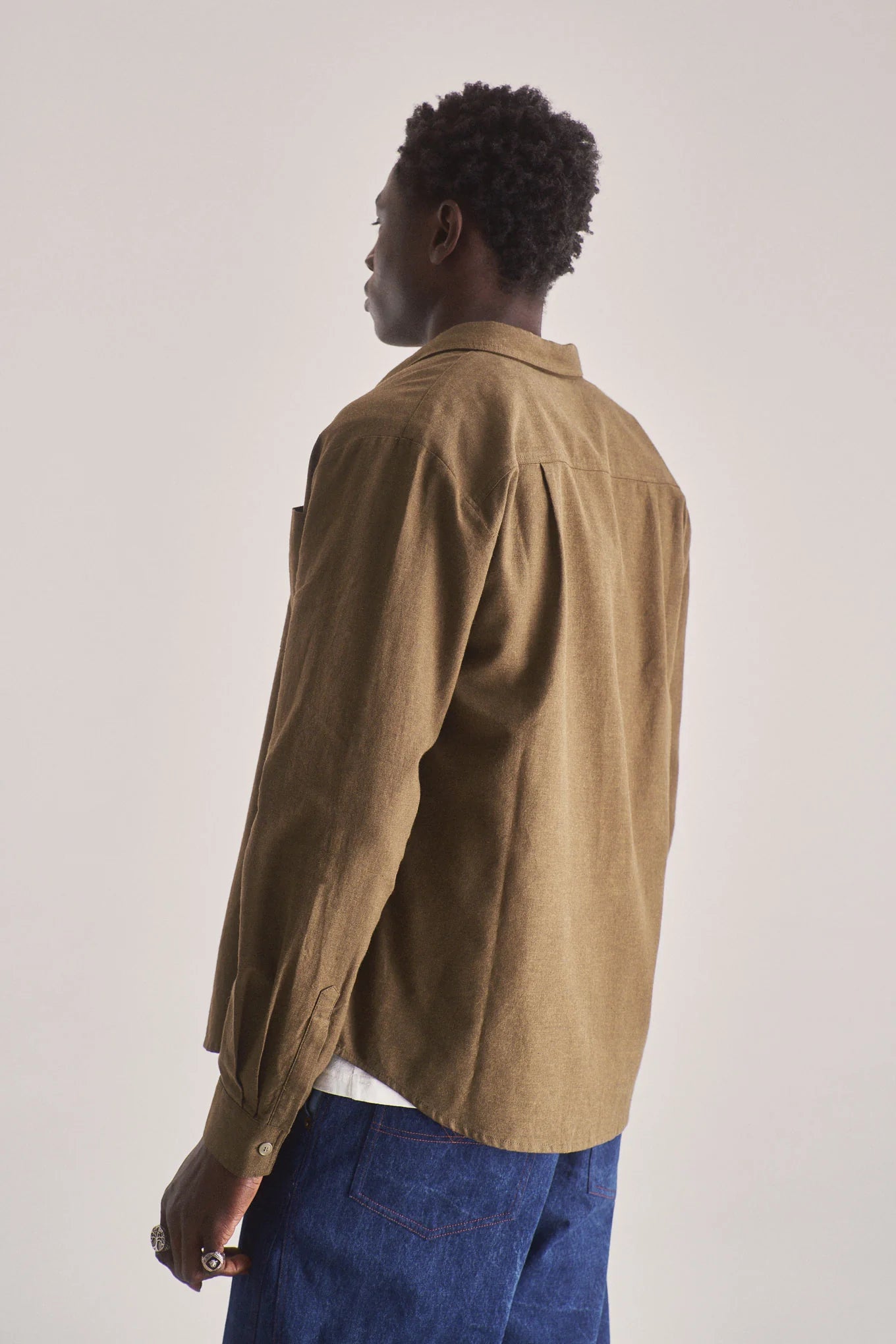 The SPECTRE Organic Cotton Shirt in Green. Made from 100% organic cotton with a soft brushed flannel finish, this oversized, loose-fit shirt offers breathable warmth and gentle feel. Ethically produced in a SEDEX-audited, vegan factory, it features durable branded corozo buttons for lasting style. Perfect for those who value both comfort and responsible fashion.