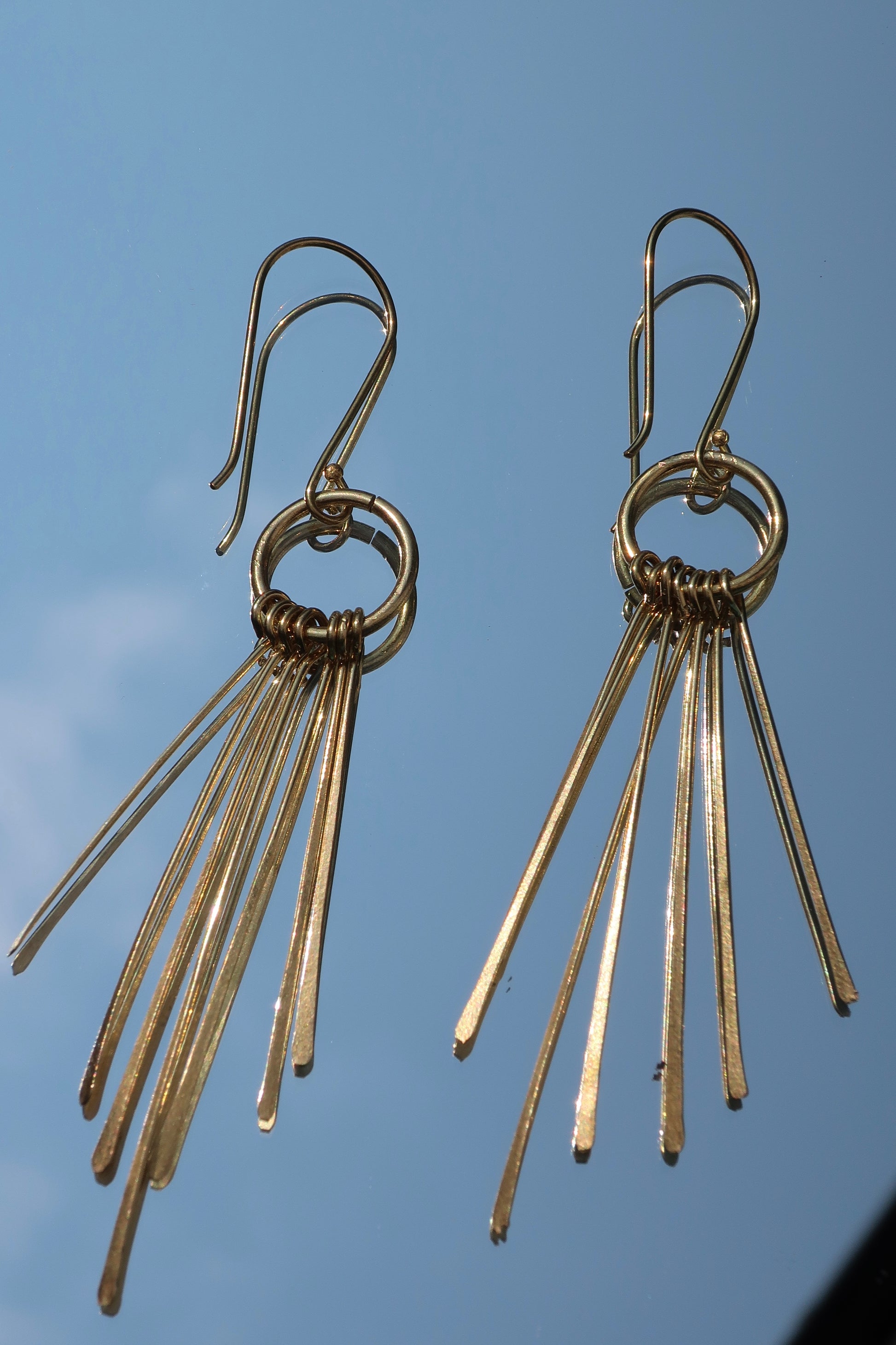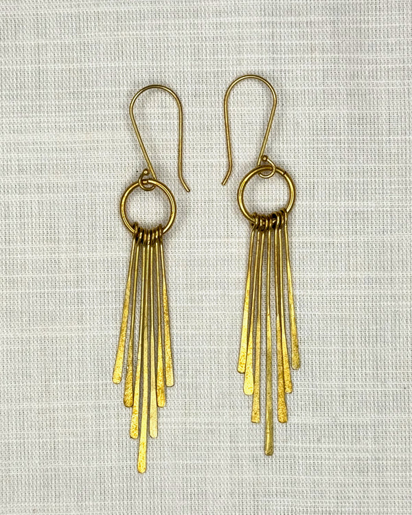 These elegant Sun-ray Dangle Earrings feature a unique brass design, perfect for adding a touch of sophistication to any outfit. Lightweight and stylish, they are ideal for both casual and formal occasions.