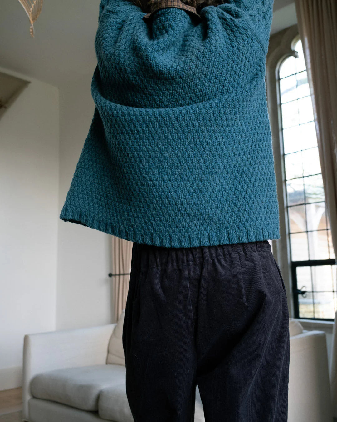 The Anna wide leg trousers in hardwearing dark dove grey 12 wale cord have been thoughtfully designed for fit and comfort. A flattering wide-leg silhouette with a simple waistband at the front and an elasticated back for an easy fit. Sits neatly at the waist and fastens with a buttoned side opening. Finished with deep, top-stitched carpenter-style pockets for added practicality. A full-length, straight-cut trouser made to last and to be lived in season after season.
